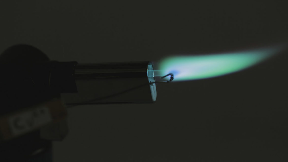 Acendemos o maçarico e levamos o arame com o sal selecionado até a chama, como podemos ver nas imagens abaixo.