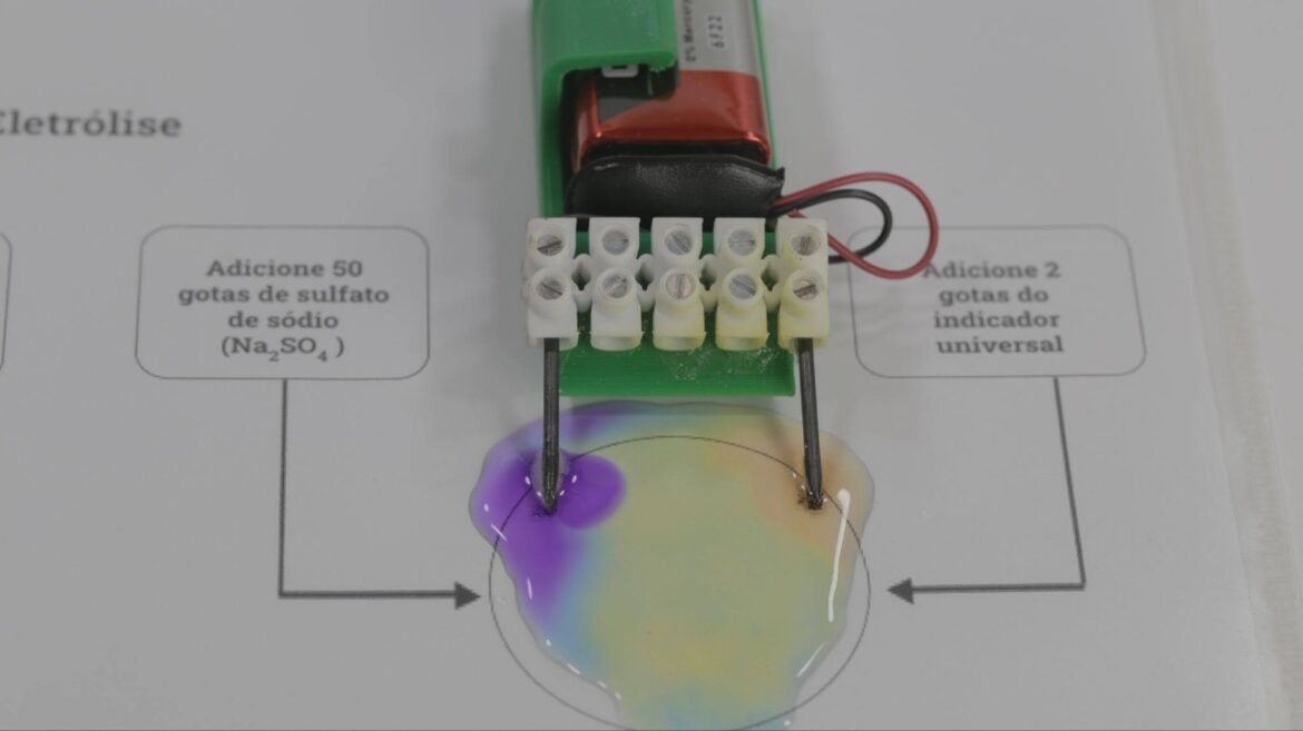 Em seguida, colocamos o aparelho de eletrólise sobre poça, de modo que os dois eletrodos estejam mergulhados na solução. Assim que o aparelho é colocado na solução, a reação inicia. Chame a atenção dos estudantes para que eles observem o que está acontecendo nos primeiros momentos da reação. Após algum tempo, os produtos da reação se espalham e a visualização pode ficar mais difícil.