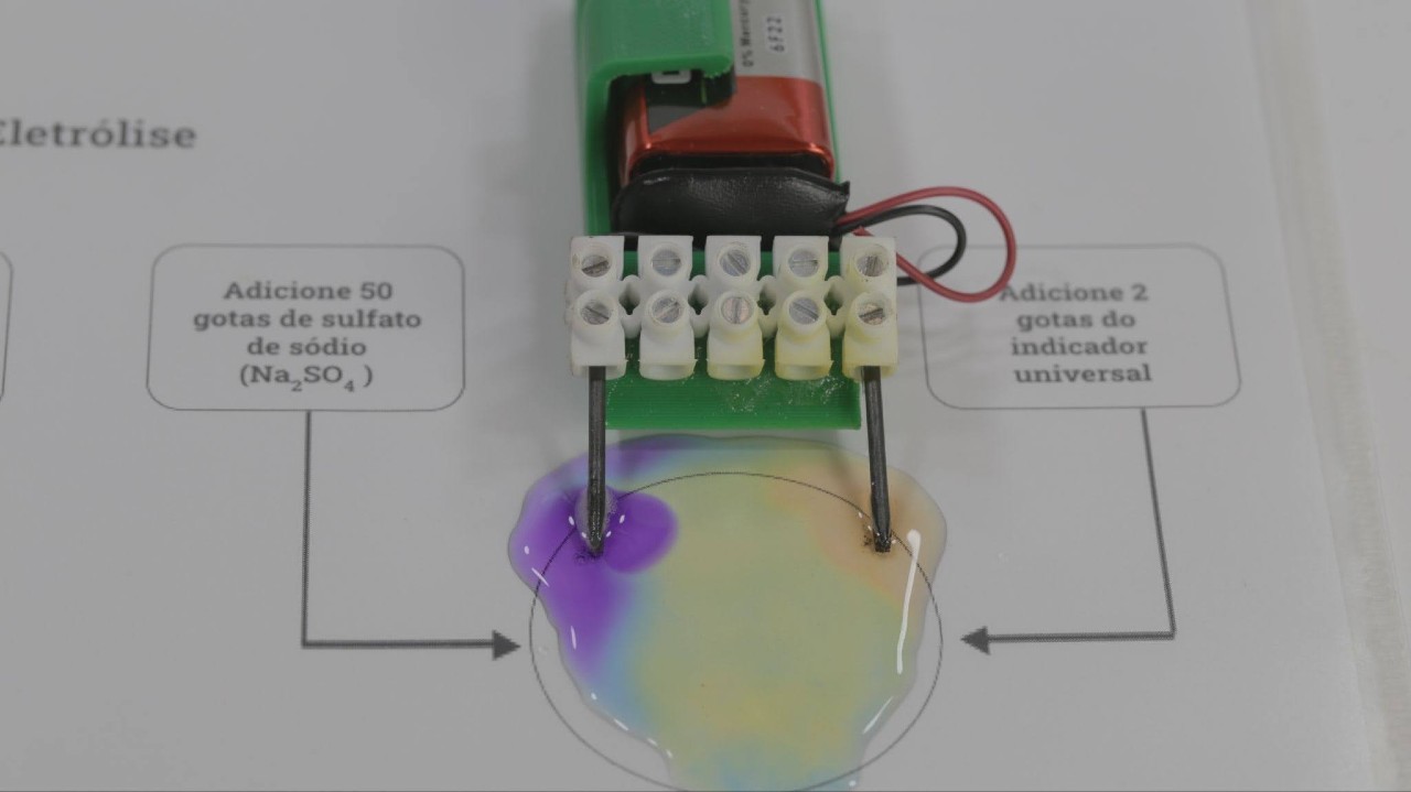 Colocamos a solução de sulfato de sódio sobre a pasta plástica no círculo correto. Adicionamos o indicador universal, que deve ficar verde. Em seguida, colocamos o aparelho de eletrólise sobre a solução, de modo a mergulhar os dois eletrodos, como no experimento anterior. Observamos a mudança de cor da solução na proximidade de cada eletrodo e a liberação de gás. Na sequência, limpamos a pasta com o papel toalha.