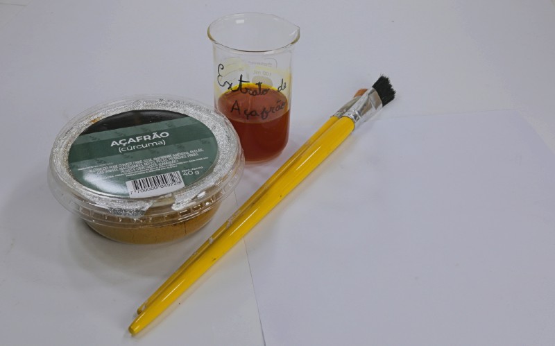Em seguida, os alunos irão selecionar um objeto ou transparência que será usada no experimento. Os objetos opacos são colocados em cima da folha pintada com o extrato de açafrão. Este conjunto é coberto com a placa de vidro