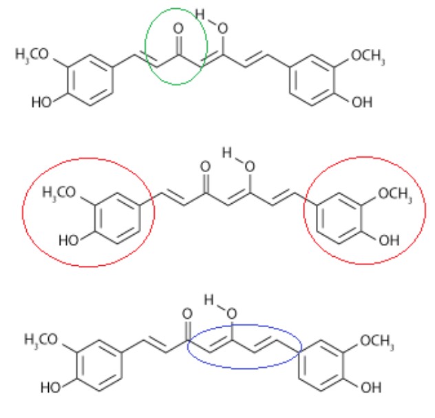 Substâncias fotossensíveis são aquelas que sofrem alterações químicas ou físicas a partir da radiação ultravioleta (UV), presente no Sol. Mas como esse tipo de radiação consegue produzir essa mudança? Para responder a isso, é necessário analisarmos a composição da curcumina. Tal composto é constituído de três grupos funcionais: uma cetona, circulado em verde, dois grupos fenólicos, em vermelho, e duas ligações duplas conjugadas, em azul.