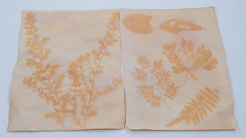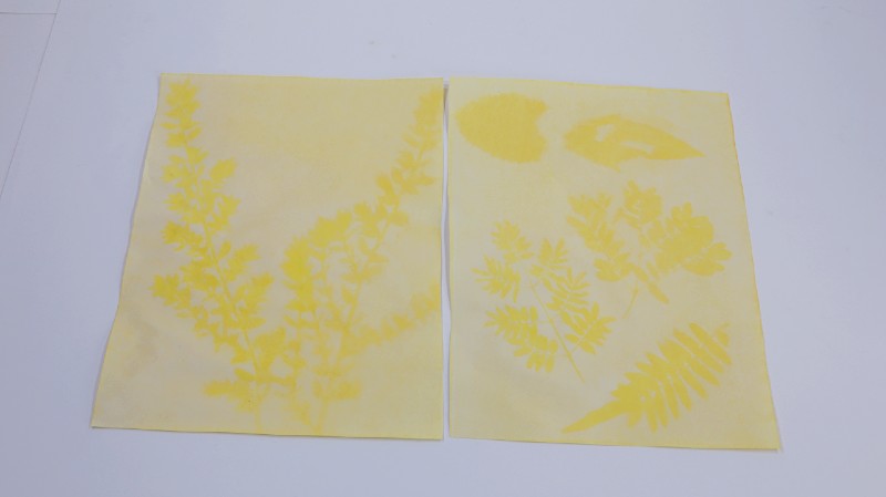 Quando retiramos as plantas, vemos que a área coberta continua amarela. Podemos colocar o papel em uma solução diluída de bicarbonato de sódio e a cor irá mudar, ficando avermelhada.