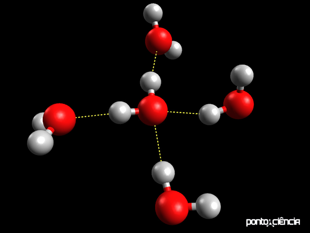 Isso faz com que as moléculas de água se orientem, de forma que os átomos de hidrogênio apontem para átomos de oxigênio de moléculas vizinhas. A interação entre moléculas de água é uma interação entre dipolos permanentes. No caso da água e outras moléculas em que temos átomos de hidrogênio interagindo com átomos de oxigênio, nitrogênio e flúor, devido à alta eletronegatividade desses átomos, a interação se torna mais forte e recebe um nome especial: ligação de hidrogênio (que é um péssimo nome, uma vez que não é uma ligação propriamente dita, mas sim uma interação molecular).