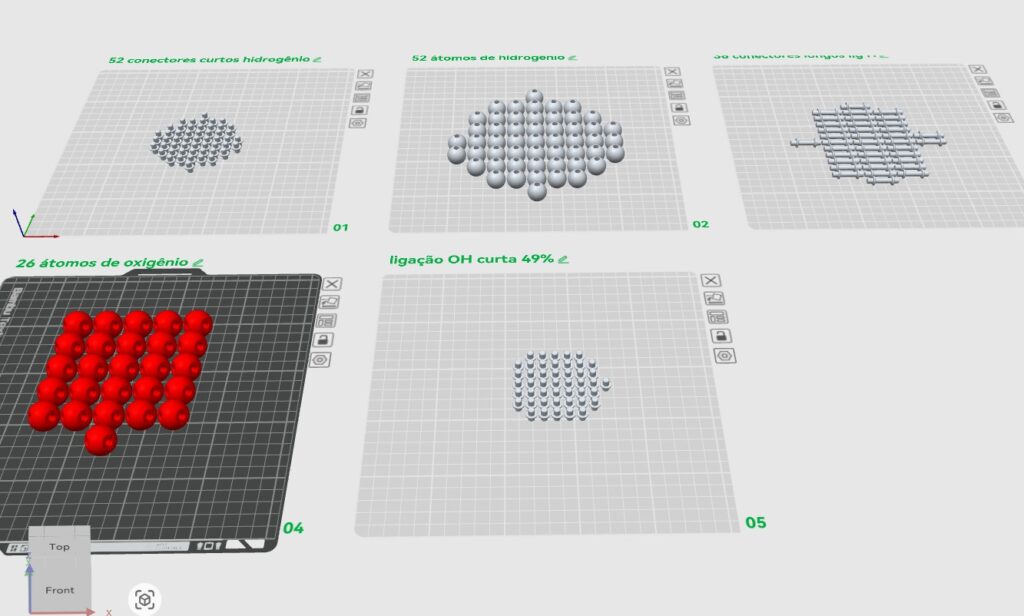 Estes modelos são clones de um modelo molecular comercial. Escolhemos este modelo de um carbono sp3, mas vamos usá-lo para imprimir os átomos de oxigênio das moléculas de água, uma vez que precisamos de 4 conexões. O outro modelo que usamos é para os átomos de hidrogênio das moléculas de água. A partir desses modelos, criamos uma conexão curta, que liga o oxigênio aos átomos de hidrogênio da água. E usamos a conexão longa criada pelo autor do modelo, para as ligações de hidrogênio que ficam entre as moléculas de água no gelo.