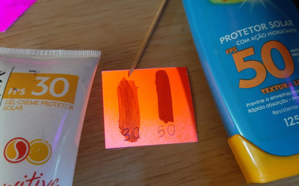 Este experimento mostra de maneira bem aplicada a fluorescência, a radiação ultravioleta e o funcionamento do protetor solar. Nós utilizamos este experimento ao falar sobre o espectro eletromagnético e em atividades de divulgação da ciência (mostras de experimentos). Gostou da atividade? Comente abaixo e compartilhe com seus colegas.