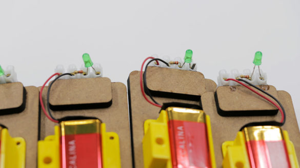 Prendemos os componentes no conector, como pode ser visto na imagem abaixo. O LED só funciona quando conectado na polaridade correta. A perna do polo positivo do LED deve estar próxima do fio vermelho (polo positivo). Os eletrodos podem ser hastes de rebites pop, pedaços de fio de cobre rígido ou mesmo pedaços de hastes grafite. Se usar grafite, tome muito cuidado ao parafusar para não quebrar as hastes.