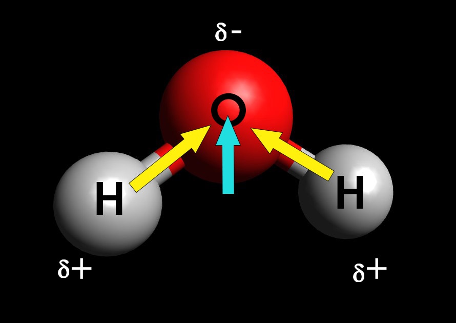 Como a molécula de água não é linear, possui um ângulo diferente de 180 graus entre os hidrogênios, o resultado da soma vetorial dos momentos de dipolo é diferente de zero: a água é uma molécula polar.