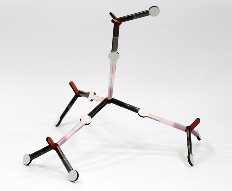 Caso você discuta com seus alunos a geometria da água usando a teoria VSEPR (aquela da repulsão dos pares de elétrons ao redor de um átomo central), vocês vão reparar que o átomo de oxigênio tem dois pares de elétrons livres. Assim, os dois pares de elétrons das ligações O-H na água e os dois pares de elétrons livres somam quatro pares – o que faz com que esses pares assumam uma geometria tetraédrica. Por isso o nosso átomo de oxigênio no modelo é um tetraedro.