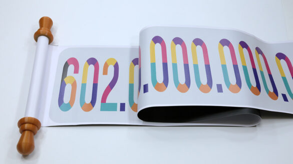 A faixa mostra a constante de Avogadro, o número de espécies químicas (átomos, moléculas, íons ou elétrons) presentes em um mol de um determinado tipo de matéria. Este número é 6,02 x 1023, ou seiscentos e dois sextilhões. Para amentar o impacto da apresentação deste número, sugerimos que você enrole a faixa e vá apresentando o número lentamente, expondo o número da parte mais à direita para a esquerda. Assim, você pode ir mostrando a quantidade de zeros no final do número, mostrando a cada 3 zeros a quantidade correspondente, milhares, milhões, bilhões, trilhões, quatrilhões, quintilhões e finalmente, os 602 sextilhões. Você pode contar os zeros com os alunos e pedir a eles que escrevam o número em notação científica.