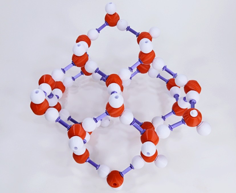 Uma das consequências das ligações de hidrogênio na água é o que acontece quando ela se torna sólida. Na água líquida, as ligações de hidrogênio são formadas e quebradas o tempo todo, à medida que as moléculas de água se movem umas sobre as outras. Ao se abaixar a temperatura, esse movimento diminui e as moléculas de água se orientam na direção das ligações de hidrogênio e, ao ocorrer a solidificação, são travadas nessa posição. O resultado é que a distância média entre as moléculas aumenta, e a densidade do gelo fica menor que a da água líquida. Podemos perceber isso no modelo, observando os espaços vazios hexagonais.